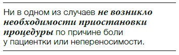 Возможные побочные явления, которые могли иметь место или о которых сообщали пациентки (во время, сразу после сеанса терапии и спустя 30 дней), не были зафиксированы.
